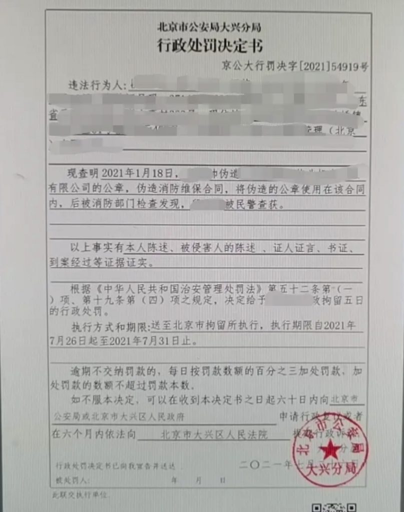 2021年7月5日,北京市消防救援總隊在開展社會消防技術服務機構(gòu)專項檢查時,發(fā)現(xiàn)某賓館提供的消防設施維保合同、記錄在形式上與一般證明文件存在出入,引起執(zhí)法人員的警覺。執(zhí)法人員隨即調(diào)取了受托機構(gòu)的印章印文并聘請專業(yè)機構(gòu)比對,鑒定意見為兩個印文非同一枚印章蓋印形成,案件初見端倪,執(zhí)法人員將調(diào)查重點聚焦到這家賓館上。