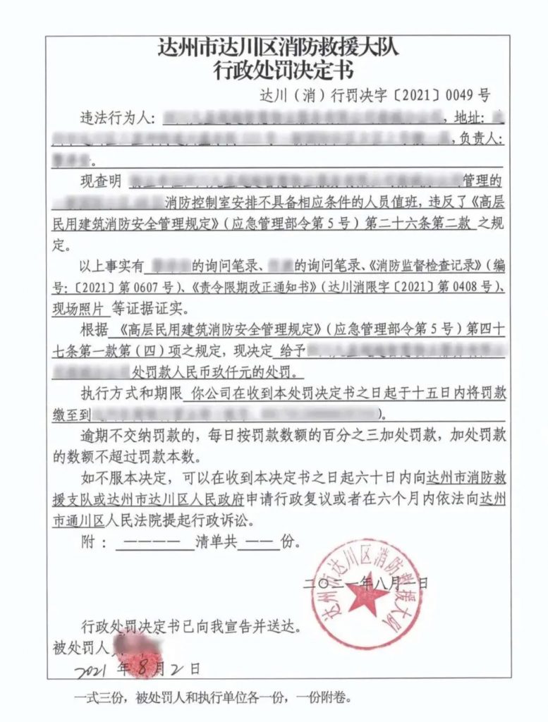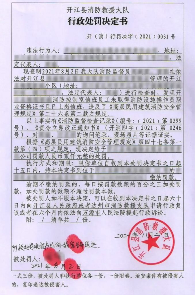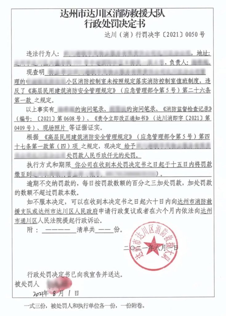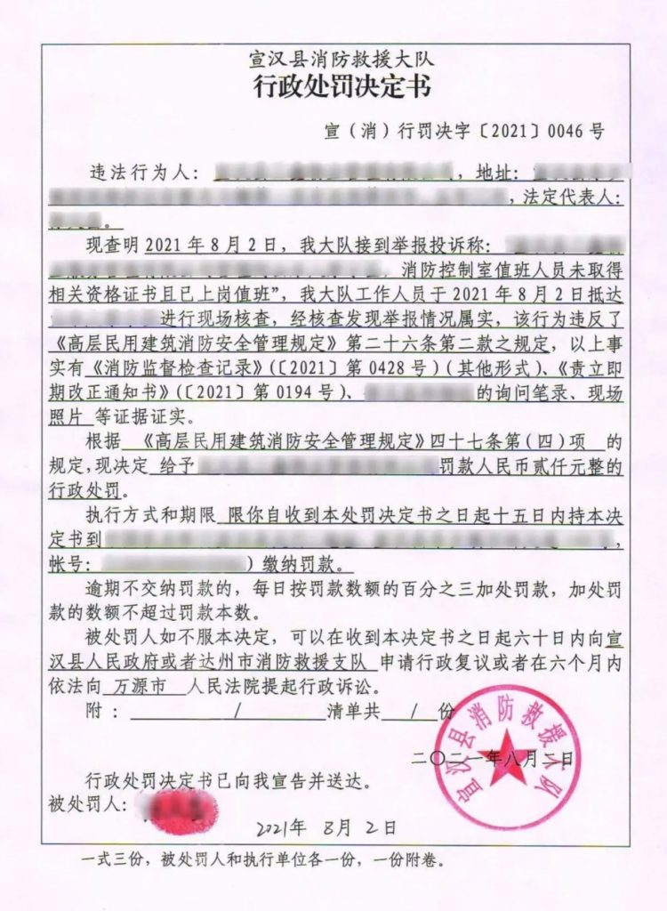 著位置公告”。由于該單位違反了《高層民用建筑消防安全管理規(guī)定》第三十二條第二款的規(guī)定,依據(jù)《高層民用建筑消防安全管理規(guī)定》第四十七條第一款第六項的規(guī)定,新區(qū)消防救援大隊依法下發(fā)《行政處罰決定書》,給予該單位罰款人民幣2000元的處罰。