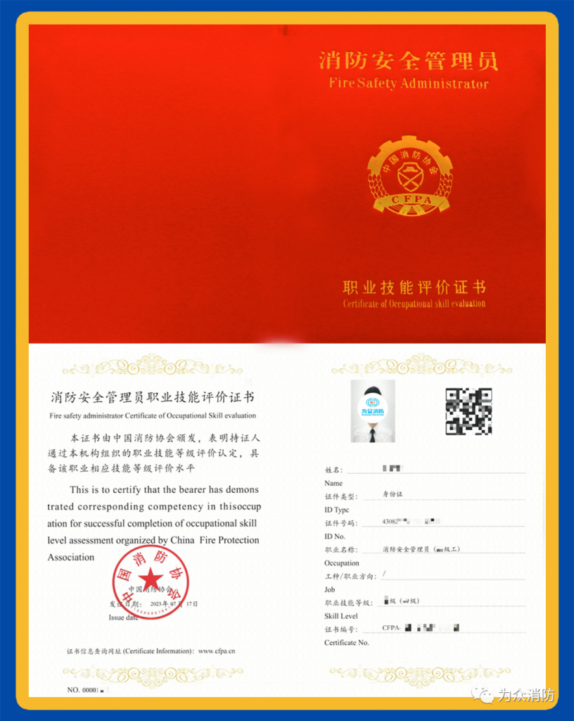 《消防安全管理員職業(yè)技能評價證書》由中國消防協(xié)會頒發(fā),此證書全國通用,長期有效。