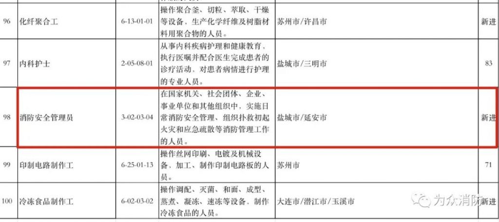收集匯總2022年第四季度人力資源市場供求關(guān)系較為緊張的招聘、求職需求職業(yè)崗位信息,形成“2022年第四季度全國招聘大于求職“最缺工”的100個職業(yè)排行”,面向社會公布。其中“消防安全管理員”職業(yè)上榜,排行第98位。這是消防職業(yè)第一次列上全國“最缺工”的100個職業(yè)排行!
