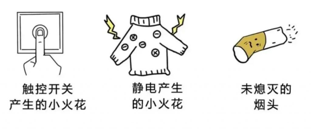 3.遇到引火源。當(dāng)處于爆炸濃度范圍內(nèi)時(shí),包括但不限于如下情形,都有可能引發(fā)爆炸。