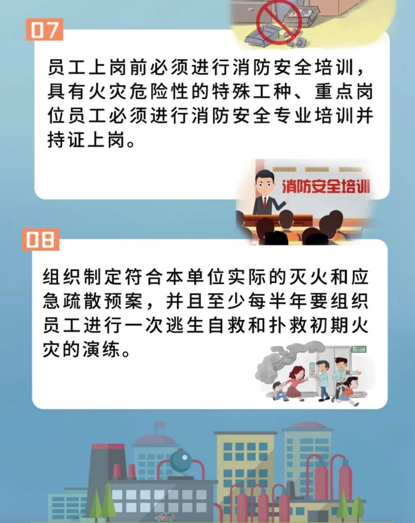 ● 小區(qū)物業(yè)要落實消防安全主體責任,保持消防設(shè)施完好,保持“生命通道”暢通,提升物業(yè)工作人員檢查消除火災隱患能力、撲救初期起火能力、組織人員疏散逃生能力、實現(xiàn)救早滅小的目的;